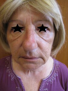 - a bőr megereszkedése, csüngése és lógása, mely több kevesebb ráncképződéssel is együtt jár. Előre haladott esetekben a bőr felesleg eléri vagy meg is haladja a szempillasort.