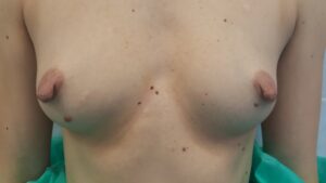 Kiegészítés: Konzultáció és részletes tájékoztatás történt a műtét előtt (technika, előnyök, hátrányok, lehetséges szövődmények). A szakorvosi műtéti javaslat adása a befordult mellbimbók korrekciójára. Műtéti terv: infiltrációs érzéstelenítésben a mellbimbókat 3 db 120 fokonként ejtett kis bőrmetszésekből kiemeljük, Belső felszívódó doháényzacskó öltéssel stabilizáljuk. Bőrvarratok, impregnált lapos kötés. Preop. fotók készültek.