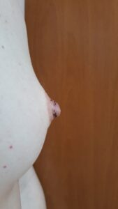 Az alkathoz és a mellek nagyságához viszonyítva aránytalanul nagy és hosszú, és vastag mellbimbók a megjelenésben, az öltözködésben okoznak elsősorban panaszokat, mivel a vékony ruházaton keresztül feltűnően és kihívóan előtűnnek.