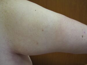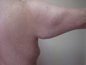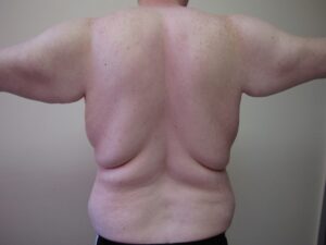 III., Kifejezett zsírpárna és következményes kontúrtöbblet. A bőr felesleg jelentős, a bőr a felkar középső harmadáig lógó, ami alap testhelyzetben is észlelhető ( a felső végtag a törzs mellett). A bőr petyhüdt és ráncos.